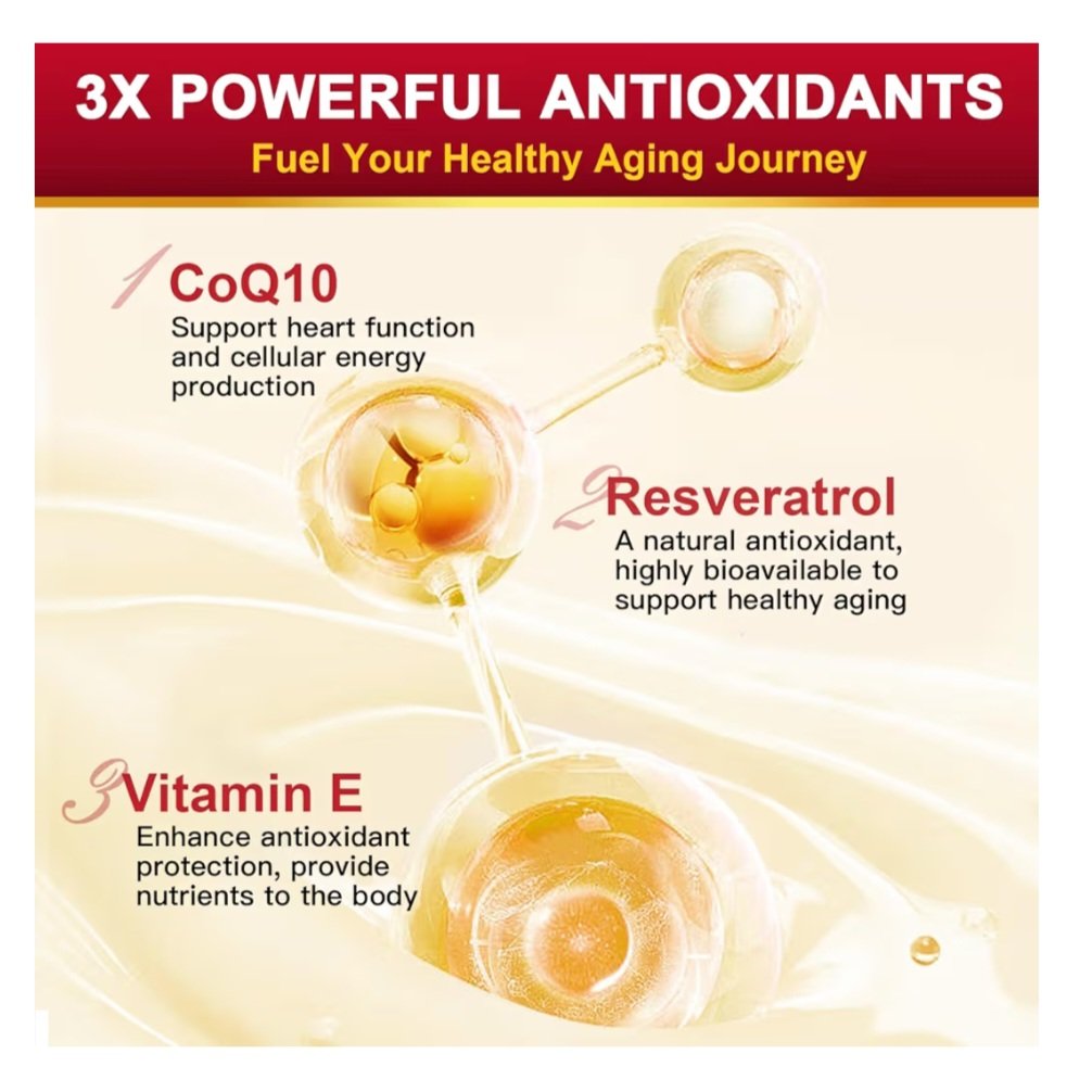 La combinación de coenzima Q10 (CoQ10) con resveratrol, vitamina E y PQQ (pirroloquinolina quinona) potencia diversos beneficios para la salud. Aquí tienes un listado de sus principales efectos: